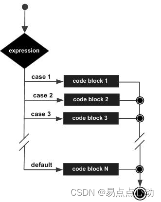 - 如果value 和整型数值1不相等,就跳过冒号后面的语句1,继续比较第二个case、第三个case……一旦发现和某个整型数值相等了,就会执行后面所有的语句。假设 value和整型数值5相等,那么就会从语句5一直执行到语句n+1
