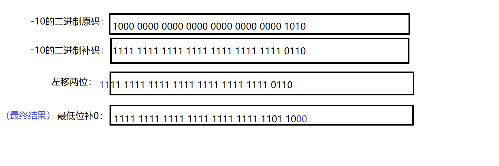 注意:无论是正数还是负数左移,最低位都是补0!!!