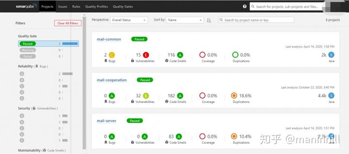 以下是项目执行情况的概览,每个项目名称代表一个项目,项目检查的结果简单呈现在项目首页概览中,包含Bug数量、漏洞数量、不规范、单元覆盖率、代码重复度等维度。