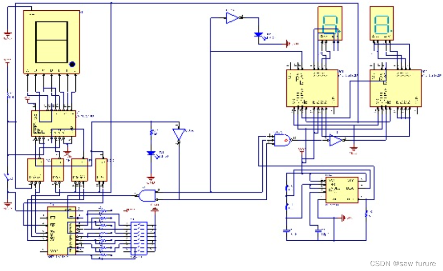 74LS48的7,6,2,3引脚接受来自74LS192的输出信号并把它译码 显示在数码管上。74LS192的9,10,11,15引脚完成时间设定功能,本设计要求定时30秒,所以把左边的芯片的1,15引脚接高电位,期于的全接低位,使的初始时间设定为30秒。555芯片完成产生秒脉冲的功能。工作过程为:抢答开始前,74LS192的置数端为低电位,处于初始状态,数码管显示为30,5引脚接高电位。抢答开始后,秒脉冲冲推动右边的芯片开始倒记时,同时右边芯片产生的信号做为左边芯片的CP信号推动左边的芯片倒记时,完成十进制的倒记时功能。当有人抢答后1Q的输出为1,经过非门后变为0,通过与门屏蔽了秒信号,停止记时,完成显示抢答时间的功能。当记到了30秒时,左边的芯片产生的定时到信号输出为低电位,也屏蔽了秒信号,使得数码管显示为00。