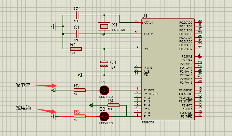 P1.7引脚上的发光二极管D2的驱动方式为“拉电流”驱动方式,当P1.7输出高电平时,D1两端有5V的电压差,发光;当P1.7输出低电平时,5V电压差将落在上拉电阻R4上,D2两端无电压差,则不发光。