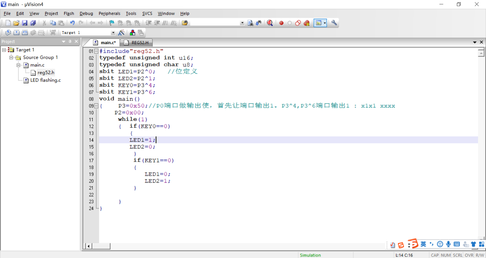 (二)当单片机P3口做输入时,首要让其端口输出1。如图中的P3^4和P3^6端口,需要先输出1。 使用keil4来编辑程序,使其实现:当KEY0按下时,D1亮;当KEY1按下时,D2亮。如图所示: