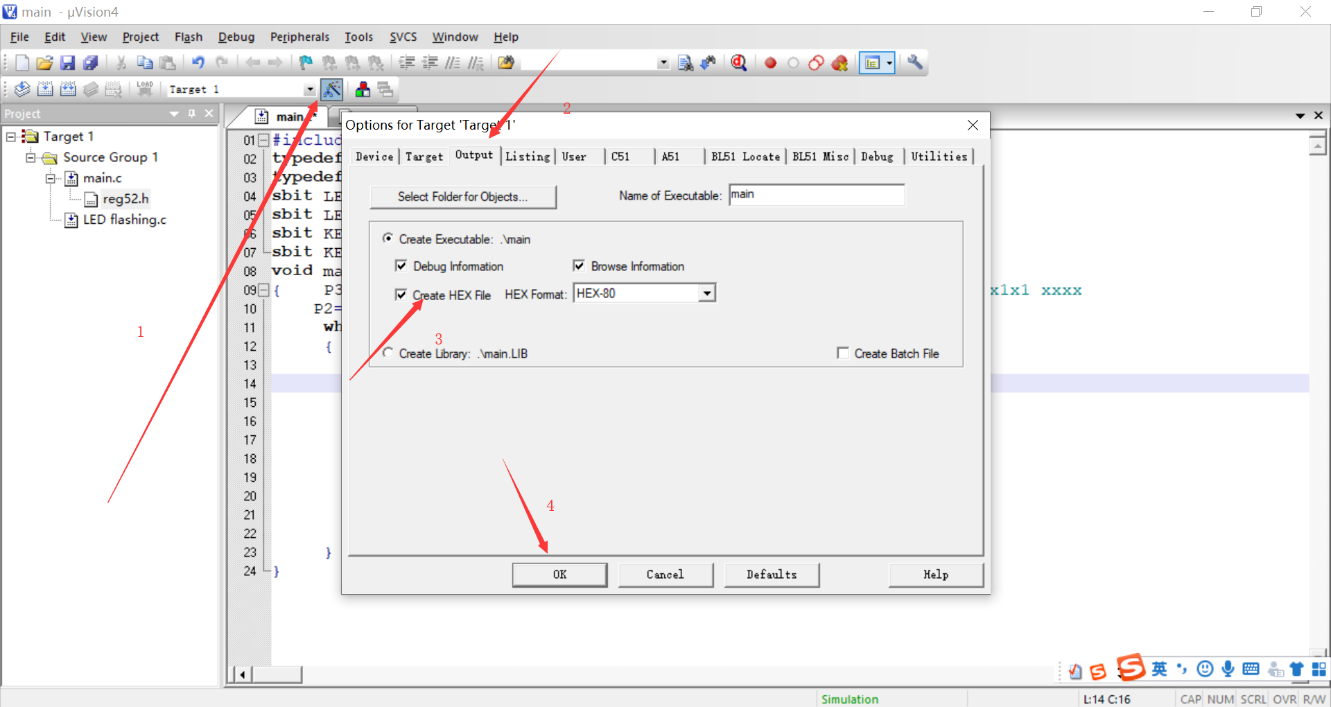 (三) 编译所写程序,并使之生成hex文件。如图:
