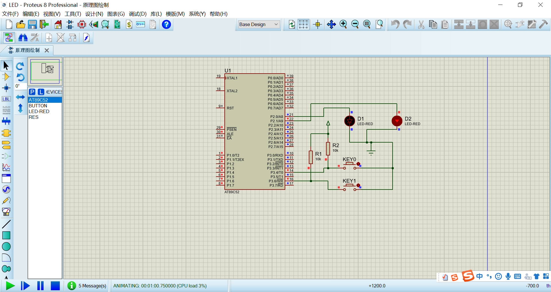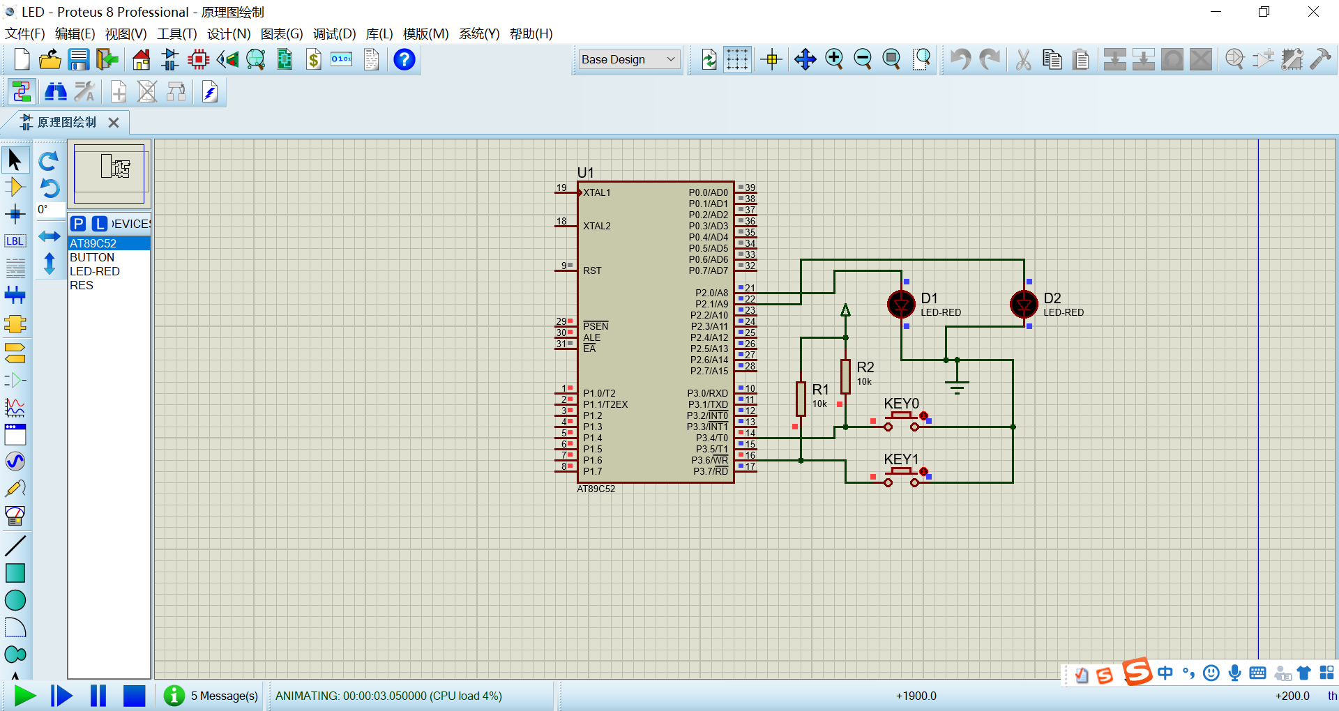 (五) 点击proteus右下角播放键。运行电路原理图。如图: