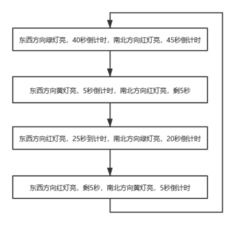 (3)东西方向红灯亮,25秒倒计时,南北方向绿灯亮,20秒倒计时。