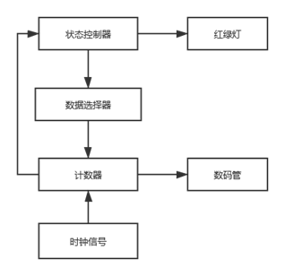 计数器随时钟信号递减,计数器每次递减到00,状态控制器加1,状态控制器输出接到数据选择器地址输入端,从而改变数据选择器的输出即计数器的输入,使计数器的置数改变,计数器又随时钟信号递减,从而实现循环置数。在计数器上接数码管,显示计数状态。状态控制器把状态信息传到红绿灯,从而控制红绿灯显示状态。