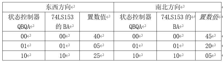 电路上电后,东西方向,状态控制器的QBQA为00,74LS153输出对应的值,计数器被置数为40,状态控制器的QBQA变为01,置数后,每有一个时钟信号到来,计数器减1。当计数器递减到00后,计数器被置数为05,状态控制器变为10,计数器一直递减。计数器再次递减到00,计数器再一次置数为25,置数后,QBQA变为00。计数器递减到00后,置数进入下一个一样的循环。南北方向,以此类推。