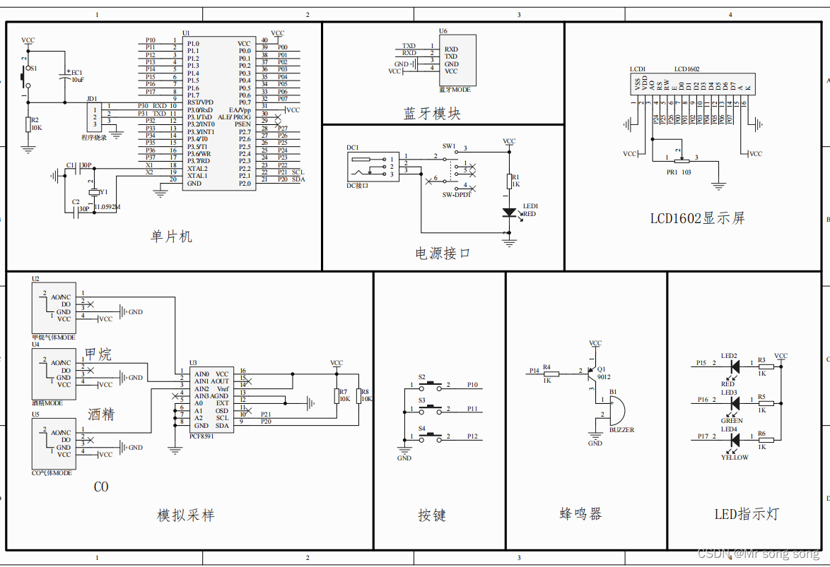 本设计由STC89C52单片机电路+LCD1602液晶显示电路+MQ-2甲烷传感器模块电路+MQ-3酒精传感器模块电路+MQ-9 CO传感器电路+A/D采样PCF8591电路+蜂鸣器报警电路+LED指示灯电路+按键电路+蓝牙模块电路+电源电路组成。