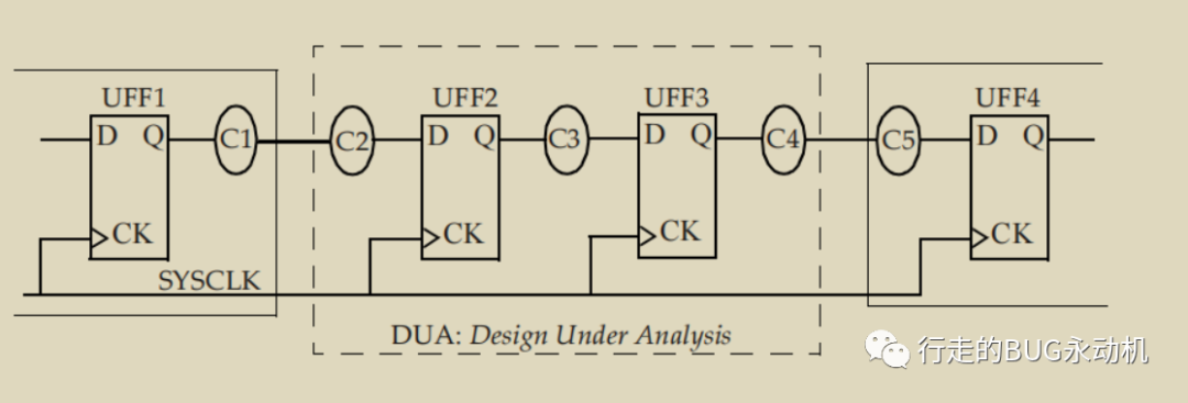 看下面这张图,假定Design Under Analysis(DUA)会与其他同步设计交互,这意味着DUA会从前一级触发器接收数据,并将数据发送到DUA后一级触发器