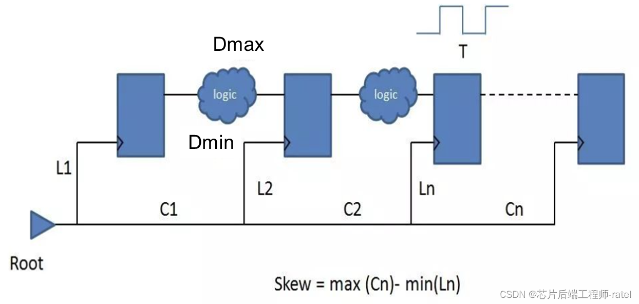 当一个时钟树有N个sink以后,这里就有了global skew概念,完全balance的时钟树就很难做,clock skew变成各个flop之间的Launch和capture clock path的最大差值。