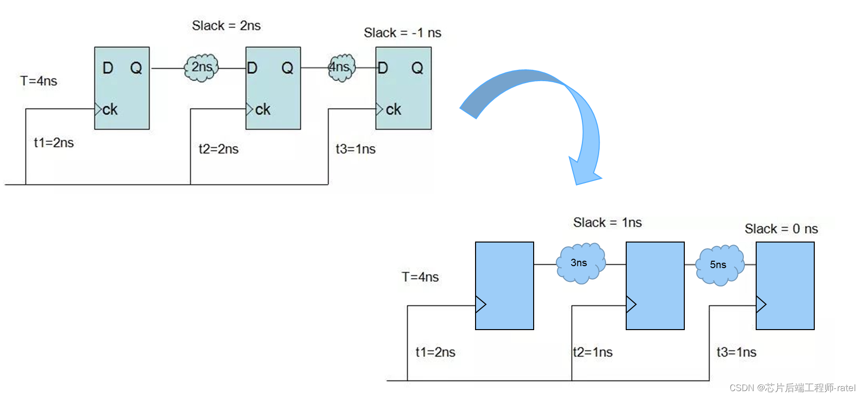 对传统的flop to flop之间的电路,setup和hold time需要满足以下两个条件,如图所示: