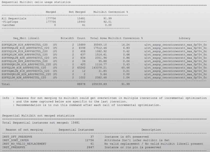 做multibit merge必须要library 支持,Genus multibit flow 的用户接口非常简单,只要设置一个变量即可,默认Genus multibit merge 是timing driven 的,如果要追求更高的merge ratio, 可以用变量控制让工具做merge 的时候不考虑timing 。