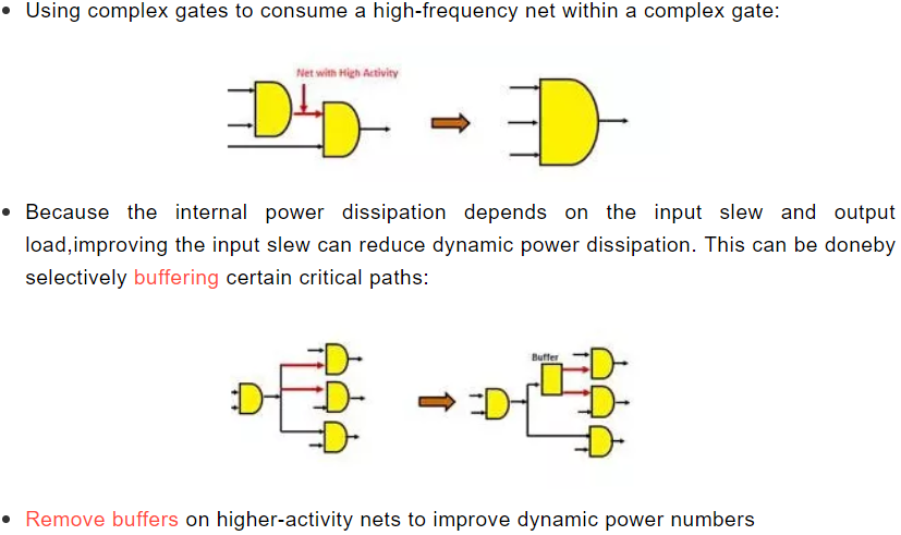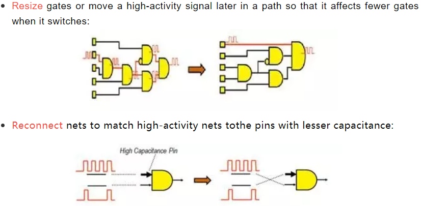 在综合或PR的时候带着真实的activity 文件(仿真波形),做动态功耗优化。通常工具会通过以下几种手段优化动态功耗: