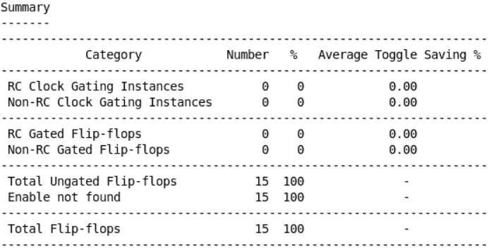 做完clock gating之后一定要用report clock_gating 检查一下插入了多少gating cell, 被gating 掉的比例有多少,及平均节省的toggle rate 是多少。