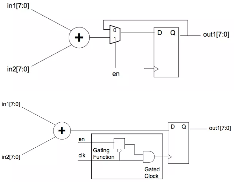 clock gating就是通过减小clock tree 的toggle rate来减小动态功耗的,其原理很简单,就是将寄存器D pin上的逻辑映射到clock pin, 通过控制clock 是否翻转来确定寄存器是否锁入新的值。如下一个简单的示例,这样有if 语句的代码在RTL 中比比皆是,这样一段代码对应的电路是 MUX + DFF,MUX 的选择端即是if 语句的『判断条件』,当条件满足时,寄存器锁入新的值,否则寄存器的值不变,对于这样一个电路而言,不论『判断条件』是否满足clock每个周期都会翻转,Post-CTS 后的网标,这条clock path上不只有这组寄存器还有一串buffer/inverter, 所以clock 每翻转一次就会消耗一次功耗,如果让clock 只在需要翻转的时候才去翻转,那动态功耗自然会减少。做法非常简单成熟,成熟工艺的library 中都有glitch free的ICG cell, 综合工具会根据用户的设置自动去完成clock gating 的『映射』或『插入』。即将原始电路中D pin的MUX 映射成clock PIN 的ICG cell, MUX的选择信号即为clock gating 的使能信号。通过这种方式大概可以减少20%左右的动态功耗。