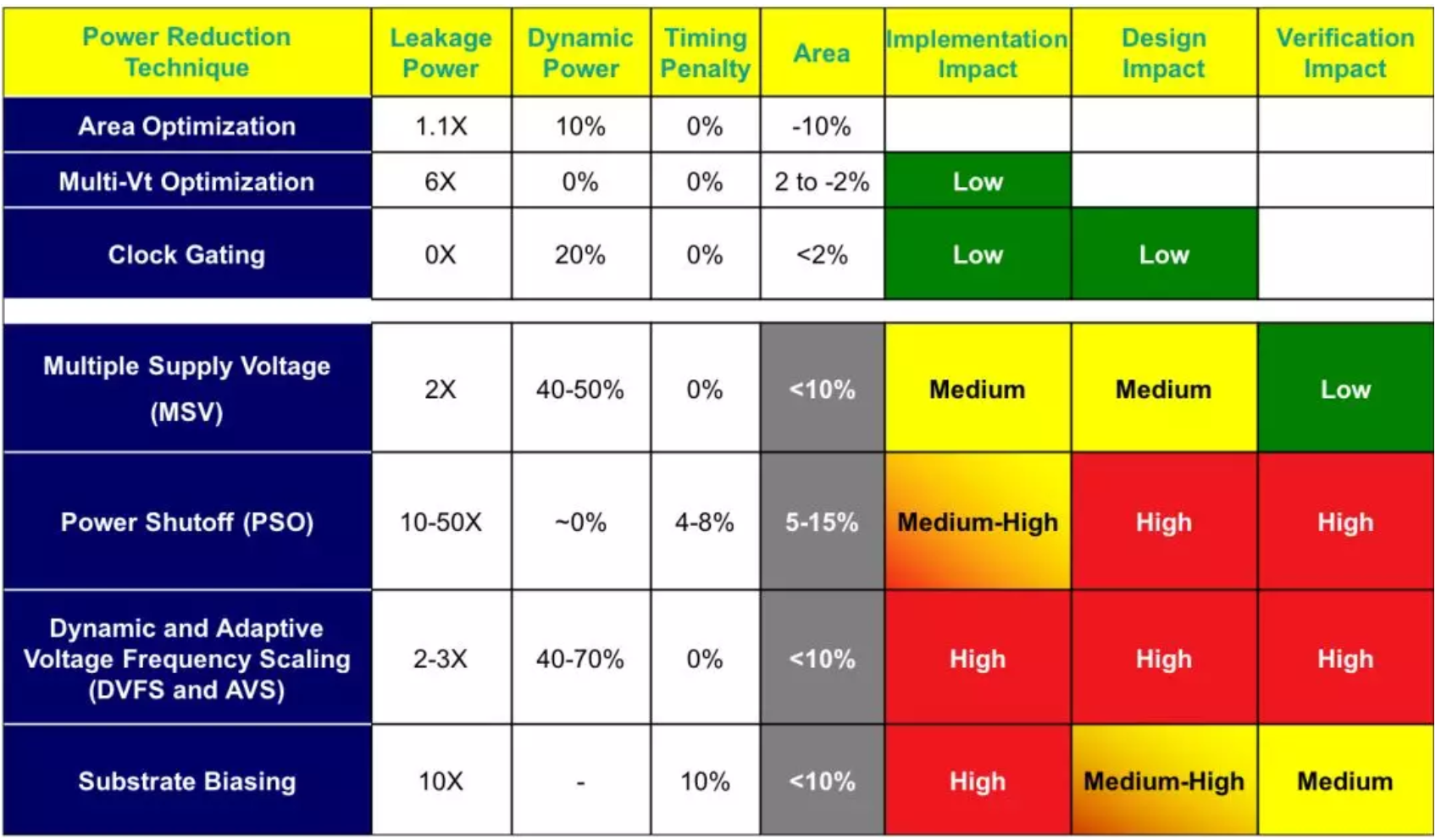 劳工们虽然触碰不到灵魂,但却不乏探索精神,他们在20%的空间内竭尽所能发挥聪明才智,探寻出了一套优化功耗的方法。下表列出了目前主流的优化功耗的方法及对设计、实现、验证各个环节的影响。论及动态功耗的优化,还是需要从动态功耗的组成及对应的计算公式入手,当工作电压和频率一定时,那优化动态功耗首要的目标就是尽量去减少toggle rate,此外对于internal power 还需要尽量减小输入pin 的transition 跟输出的load,对于负载功耗当然是尽量减小负载电容。基于此大致有如下几种优化动态功耗的方式:
