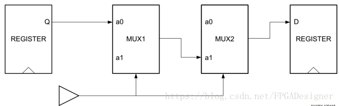 两个多路选择器MUX控制两个寄存器间的数据传输,但是两个MUX采用同一个选择信号。仔细分析会发现,无论如何Q端数据都无法传递到D端。虽然结构图上看起来Q和D之间存在一条路径,但是没有起到任何功能,因此应该定义为虚假路径。