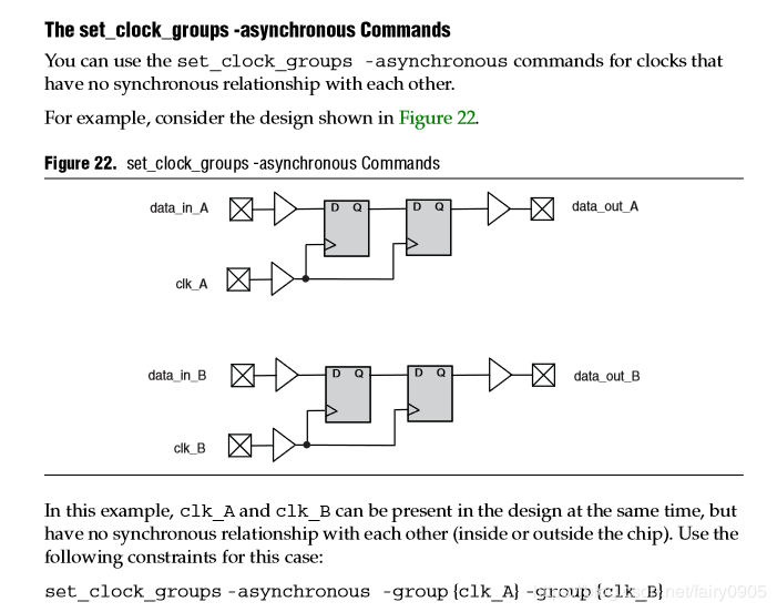 从最后一个例子可知,我们需要双向地禁用时序路径,但是如果设计中有多个异步时钟域,编写起来就非常麻烦。这种情况最好其实应该使用set_clock_groups设置不同的异步时钟组。就是说