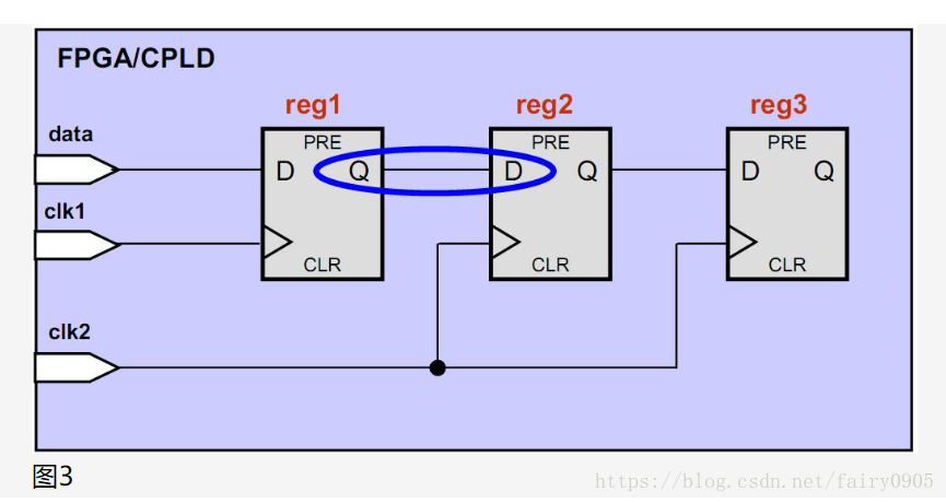 如上图所示FIFO,在存储器外部有一些用FPGA逻辑搭建的写指针和读指针控制,分属不同的时钟域,存在跨时钟域的时序路径。
