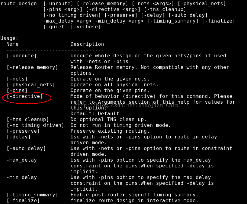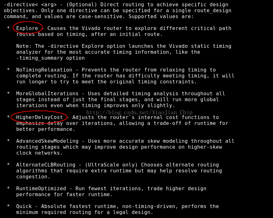 - 类似的,也可以替换route_design时的策略,在vivado中输入route_design -help来看-directive可以选择哪些策略,需要注意,这些策略和vivado的版本有关,随着vivado的版本更新,大家可能看到一些新的策略。