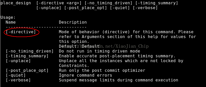 - 尝试不同的Place策略,Vivado的P&R过程是可以选择不同策略的,大家最好在vivado 的tcl命令行中,输入place_design -help,可以看本文附图的Log,注意我圈出来的选项,-directive有丰富的选择,如果在你的flow里不做配置,会用Default,可以尝试Explore、ExtraNetDelay_high等策略;