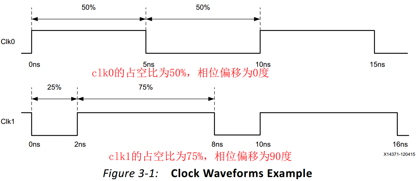 - 波形(waveform)以列表的形式给出,表中包含上升沿和下降沿在周期中的绝对时间,以ns为单位;第一个上升沿对应于第一个值,第一个下降沿对应第二个值;默认情况下,相位偏移从0ns开始,占空比为50%;