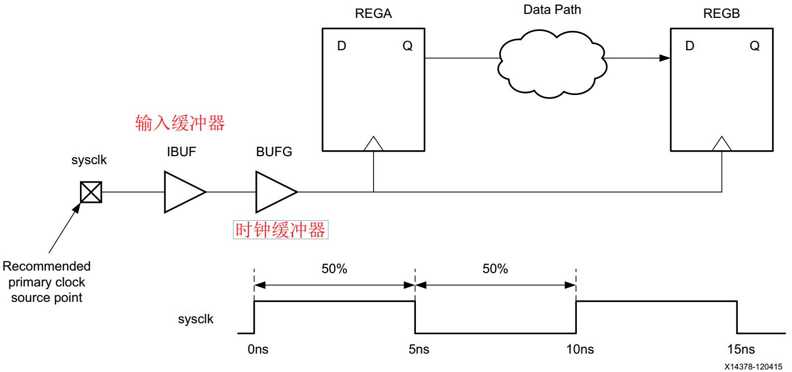 板级时钟通过sysclk端口进入FPGA,通过一个输入缓冲器和一个时钟缓冲器后到达寄存器,使用如下命令定义: