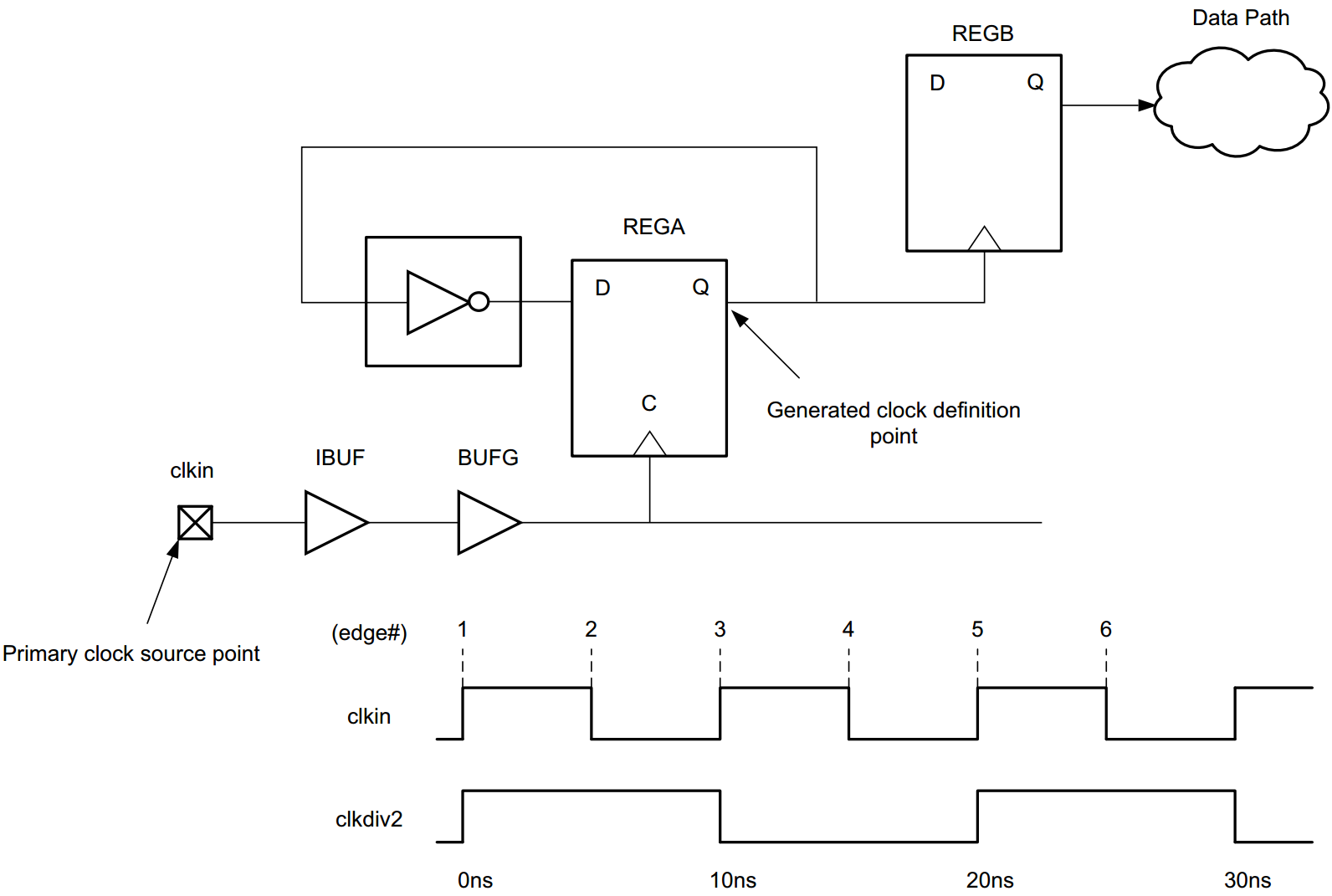 create_generated_clock -name clkdiv2 -source [get_pins REGA/C] -divide_by 2 [get_pins REGA/Q]