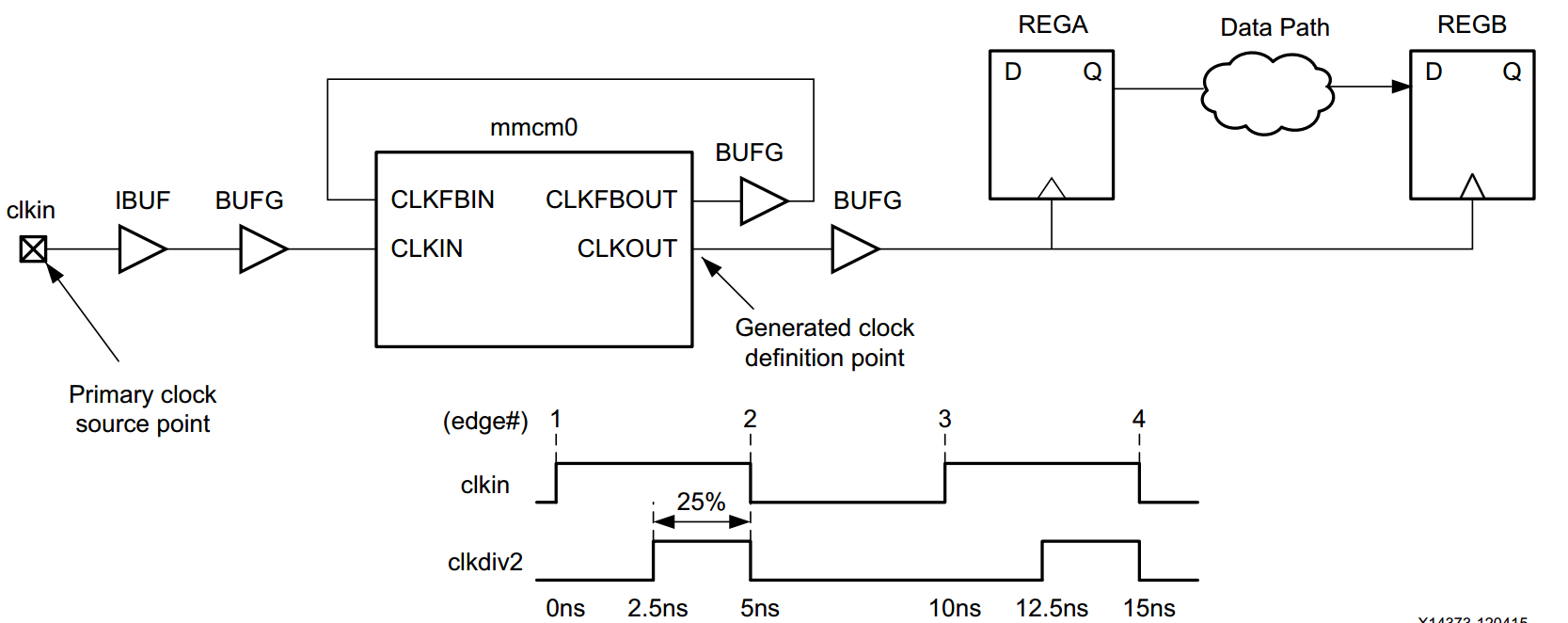 通常板子上有一个外部组件(如有源晶振)产生时钟信号,通过输入端口进入器件内部;外部时钟可以通过MMCM、PLL、BUFR等特殊原语生成其它时钟,也可以由LUT、寄存器等常规单元进行转换(通常称作门控时钟);接下来的部分将讲述如何由源时钟定义成其他类型的时钟;