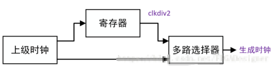 前面简单介绍了-combinational选项的使用,为了更好理解,这里举一个具体例子;下图中,上级时钟同时传递到寄存器和多路选择器中,寄存器对时钟进行2分频,多路选择器从寄存器的2分频时钟和上级时钟中选择一个作为生成时钟输出 :