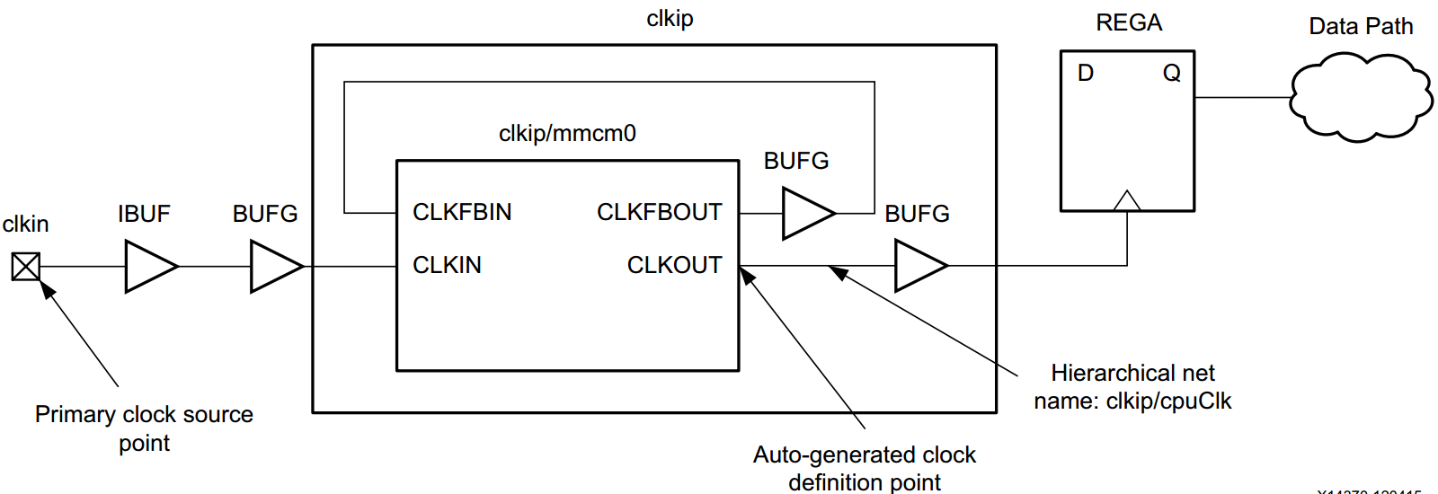 下面给出一个具体例子,下图中上级时钟clkin驱动clkip/mmcm0单元的CLKIN输入,该单元是一个MMCME2资源的实例,则自动生成时钟的定义源点为clkip/mmcm0/CLKOUT,顶层与此源点连接的网络名为clkip/cpuClk,自动生成时钟的名字便是cpuClk: