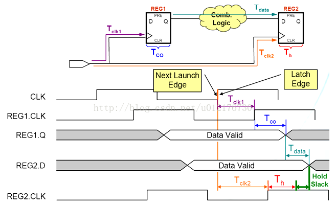 如上图所示,在0时刻(Launch edge),源时钟CLK说,“啊,我要产生一个新的数据”,但是这个命令(启动沿)并没有马上传达到REG1,而是有个延时Tclk1。所以在Tclk1时刻,REG1终于听到了(感受到了有效的时钟上升沿,就是启动沿)老大的命令,就开始准备,他憋了一会儿,又延时了Tco,终于产生了数据(REG1.Q上有了valid data);这个有效数据也是慢吞吞的来到了他的终点,又浪费了Tdata。最终在Tclk1+Tco+Tdata时间后,REG2得到了这个数据;别以为REG2得到这个数据就完事了,REG2也是个傲娇的娃,怎么个傲娇法,下面继续分析;老大CLK在0时刻发送了启动沿之后,休息了一个时钟周期,在Latch edge时突然想起来,刚才让REG1发出的数据,REG2要接受啊,不然就浪费了,于是乎他又对REG2下达了命令,新数据要来了,准备好接受!但是这个命令也不是马上就到了REG2的耳中,而是经过了Tclk2的时间。等到REG2接收到命令后(实际感受到了有效的Latch Edge),他就看看自己家门口没有数据已经来了(检查REG2.D是否有数据),同时要看看这个数据是不是符合他的胃口的(满足锁存的条件),他要求数据必须在他接收到老大命令的时候已经等了Tsu时间(数据建立时间),由要求这个数据在他家门口不能早退,必要再保持Th时间(数据保持),如果都满足了,REG2就开心的接受了这个数据,反之,他就会觉得,REG1准备的数据太懒惰了(没有提前Tsu时间到达),又或者性子太急(没有多逗留th),一概不收!