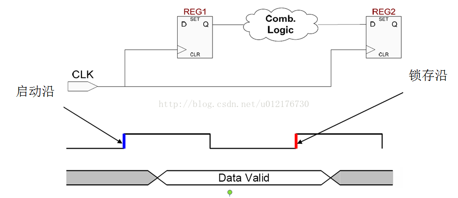 对于如上图所示的级联的寄存器电路而言(忽略上一级触发器输出到下一级触发器输入之间的逻辑关系),一般蓝色的上升沿作为第一个触发器的启动沿,而红色的上升沿(一般都是紧跟着启动沿后的有效边沿)。所以说:蓝色的启动沿之后由REG1输出有效数据,并在红色的边沿被锁存进REG2并输出到下级。