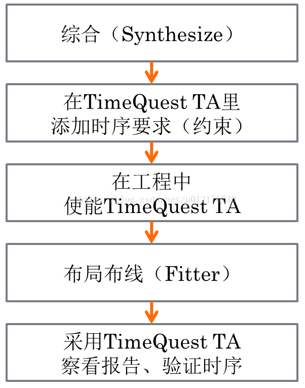 简单地说,静态时序分析(STA)告诉我们电路的实际表现如何,而提供约束(SDC文件,即上面的要求)来告诉分析工具我们希望电路的表现应该是怎样。Quartus II自带的STA工具TimeQuest TA在整个FPGA设计过程中的使用流程如下图所示:
