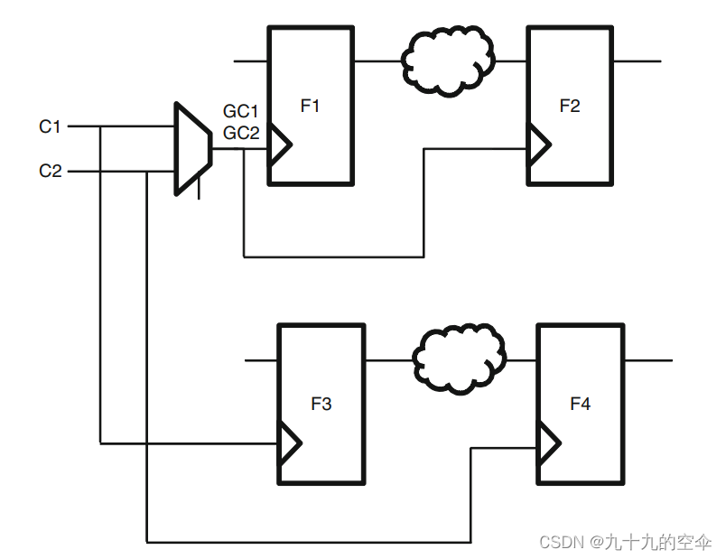 如上图所示C1和C2是典型的logically exclusive,他们共存于设计中,而且时钟信号同时都有,但他们没有任何交互。