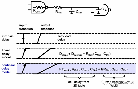 线性模型由三部分组成:Dslope表示单元输入信号的延时、Dintrinsic表示单元的固有延时、Rcell(Cnet,Cpin)表示输出的管脚电容和连线电容对单元的附加延时。