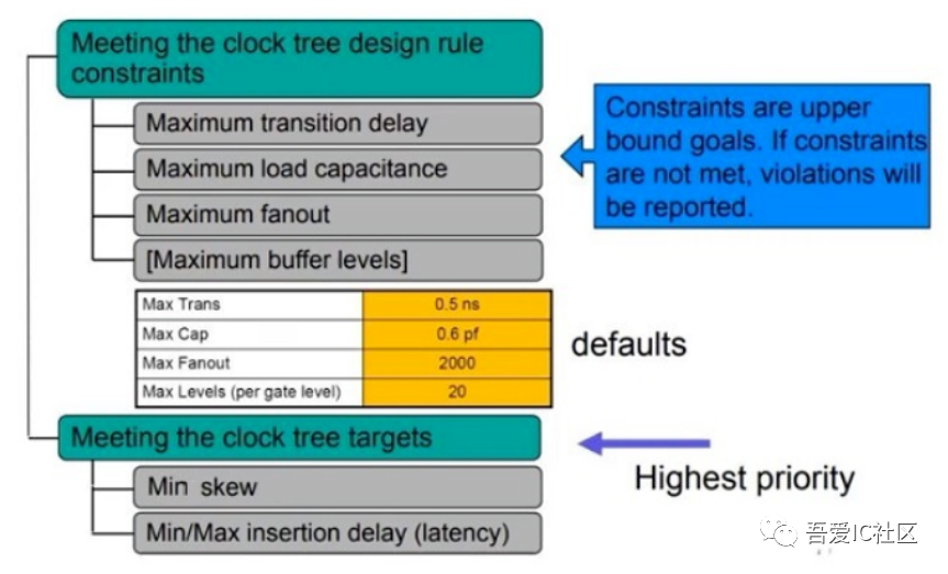 时钟树综合的目标很明确。在实现 clock insertion delay 和 clock skew 最小化的同时还得把 DRV 控制在一个合理范围内。
