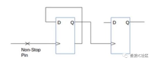 Non-stop pin 其实就是它的字面意思,即不是时钟的终点。上图中的例子前面那颗寄存器的输出产生一个分频时钟,这颗寄存器的 CK 默认就是 non-stop pin,后面那颗寄存器就是传统的 sink 点,即时钟树的一个终点。