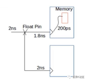什么时候要设置 floating pin 呢?工具默认是会把同一个 clock 下带的 sink 做平。如果一个设计如上图所示,一个时钟 root 既有到寄存器的,也有到 Memory 的,而且 memory 内部有 200ps 的 tree(这里的 memory 也可以理解成为一个子模块),那么我们就得告诉工具时钟从 root 长到 Memory 的 CK 要比其他寄存器做短 200ps,这样才能保证 flatten 后看到的实际 tree 的长度是差不多的。