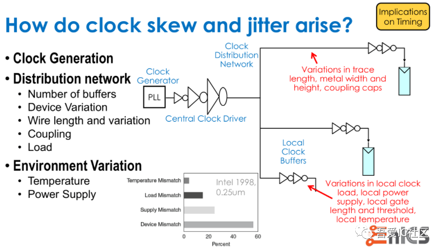 一个时钟信号如果要走很长的路才到它要去的地方,是很容易有 jitter 的。jitter 的产生及分析可以说是非常复杂的。有兴趣深入研究的同学可以下载几份 paper 来研读下。