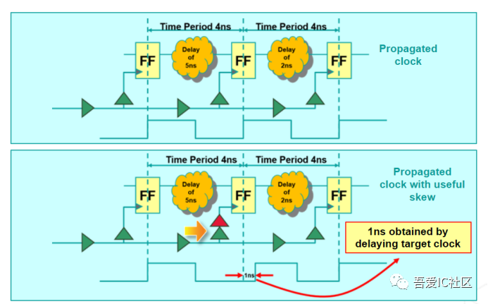 这种就是利用 clock skew 即把 FF1 和 FF2 的 skew 做的更大点来实现的。此时因为这个 skew 是对 timing 是有利的,所以我们称之为 useful skew。