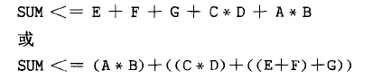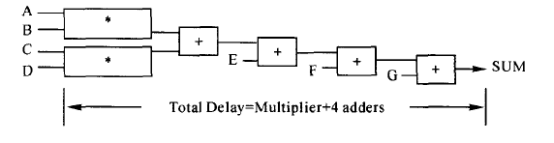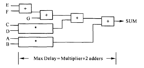 电路的总延迟等于一个乘法器的延迟加上4个加法器的延迟。为了使电路的延迟减少,我们可以改变表达式的次序或用括号强制电路用不同的拓扑结构。如: