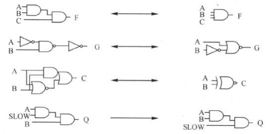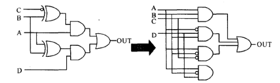 展平优化把组合逻辑路径减少为两级,变为乘积之和(sum-of-products,简称SOP)的电路,即先与(and)后或(or)的电路,如下图所示: