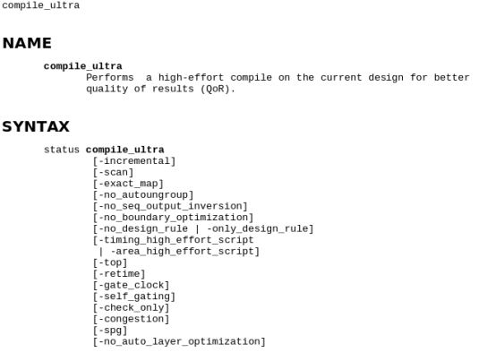 compile_ultra命令支持DFT流程,此外compile_ultra命令非常简单易用,它的开关选项有: