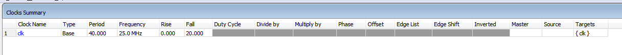 如图36,在任务窗口双击report clocks后观察信息显示窗口的时钟情况,这里能看到每一个被约束的时钟,它们各自的周期、频率、类型,源时钟等。