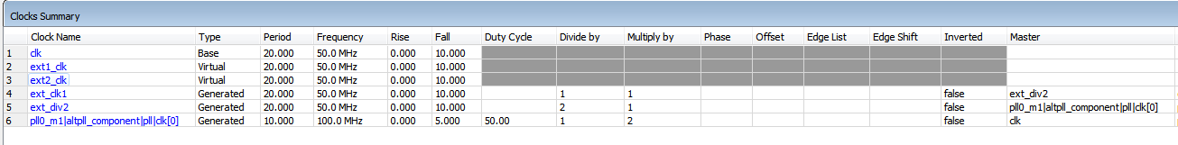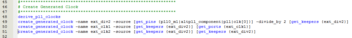 约束ext_div2 : create_generated_clock -name ext_div2 -source [get_pins {pll0_m1|altpll_component|pll|clk[0]}] -divide_by 2 [get_keepers {ext_div2}]