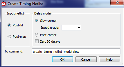 通常情况下,我们会选择post-fit和slow-corner组合,如果在这样的情况下,设计都满足时序要求,那么我们的设计会更可靠。其实任务窗口中的create_timing_netlist默认就是这种组合,所以我们点击这个选项就可以了。