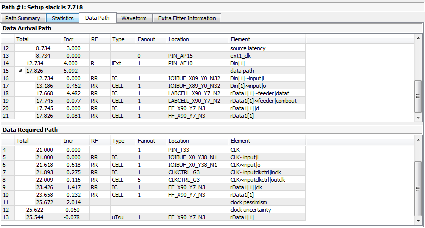 然后我们通过data path分析中可以知道data arrival path和data required path的值,看最后一行,data arrival path的值是17.826ns,data required path的值是25.544ns,根据公式可以求得setup slack是7.718ns,当然我们添加约束命令后,这些计算都是timequest自己做的事,与设计者无关。