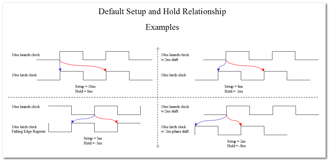 建立关系值:目的寄存器锁存沿(latch clock)-源寄存器启动沿(launch clock)。数据在第一个时钟沿从源寄存器发出去,在第二个时钟沿存入目的寄存器,建立关系值就是指这两个时钟的距离。