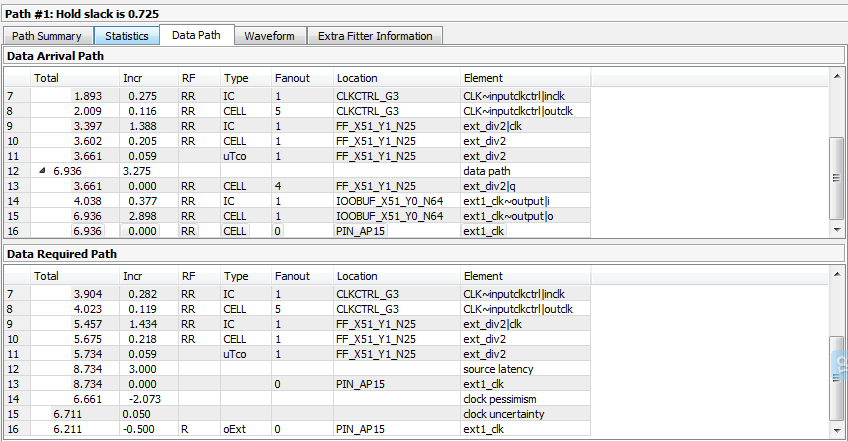 建立余量与保持余量的Data Arrival Path的计算是一样的,不同的是建立余量Data Required Path的Latch Edge是当前锁存沿,而保持余量data required path的Latch Edge是上一个锁存沿。